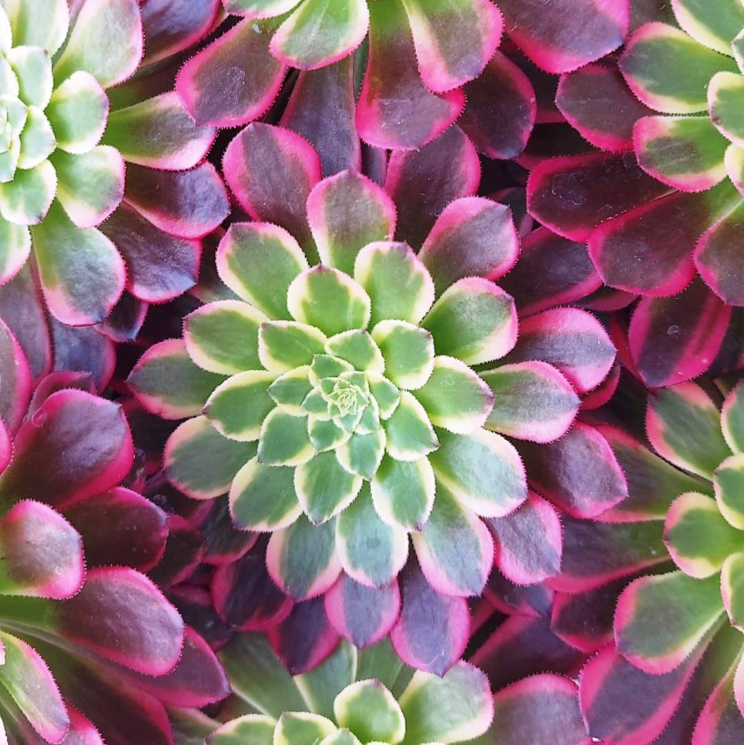 Splendido Aeonium le cui foglie sono variegate con strisce rosa, verde, giallo e rosso, creando un sorprendente contrasto di colore all’interno della pianta.