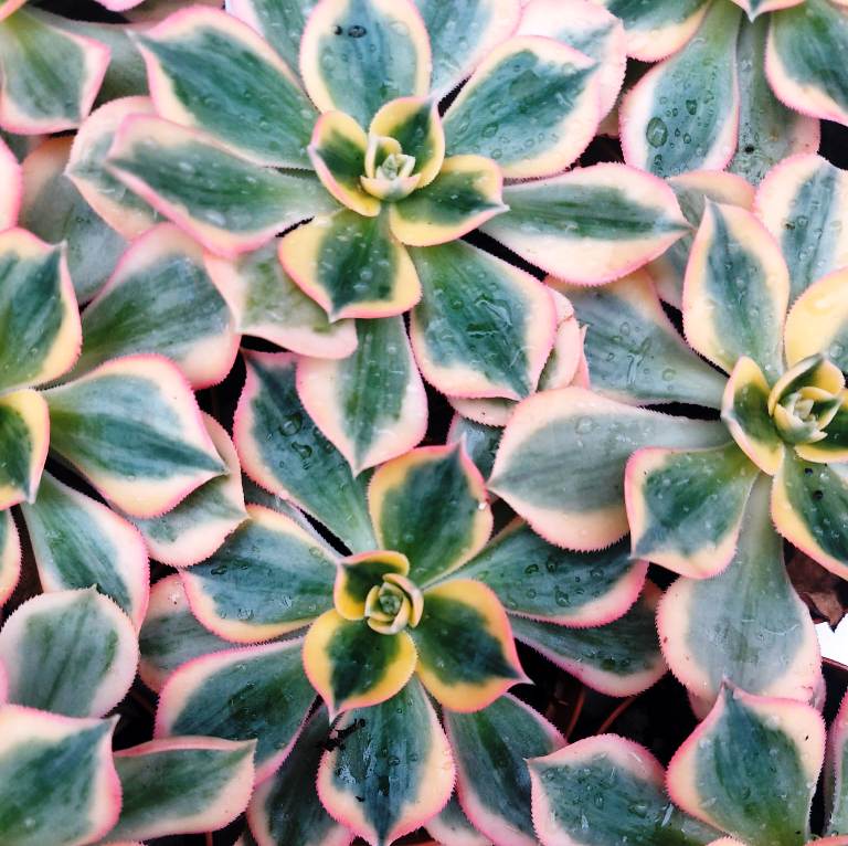 Grande rosetta di foglie affusolate e striate. Il colore varia dal verde al rosa che si sfumano tra loro a seconda dell’esposizione al sole.